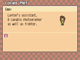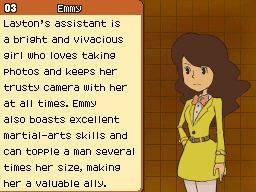 Layton's assistant is a bright and vivacious girl who loves taking photos and keeps her trusty camera with her at all times. Emmy also boasts excellent martial-arts skills and can topple a man several times her size, making her a valuable ally.