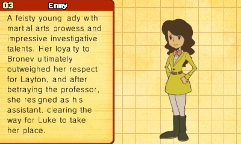 Layton's assistant, Emmy, is a bright and vivacious girl who boasts excellent martial-arts skills to complement Layton's sharp intellect. With her trusty camera at hand, she's always prepared to rush in headfirst, but despite her tomboyish nature, she harbors an unseen delicate side.