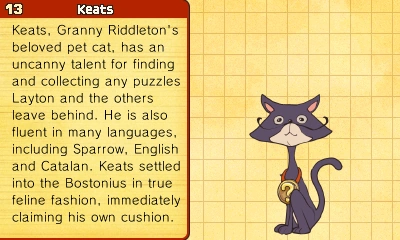 Keats, Granny Riddleton's beloved pet cat, has an uncanny talent for finding and collecting any puzzles Layton and the others leave behind. He is also fluent in many languages, including Sparrow, English and Catalan. Keats settled into the Bostonius in true feline fashion, immediately claiming his own cushion.