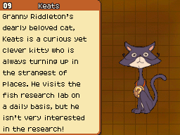 Keats is a cat that appears in Professor Layton and the Last Specter and Professor Layton and the Azran Legacy. He belongs to Granny Riddleton and looks after all of the puzzles you miss during the game for you to solve later.