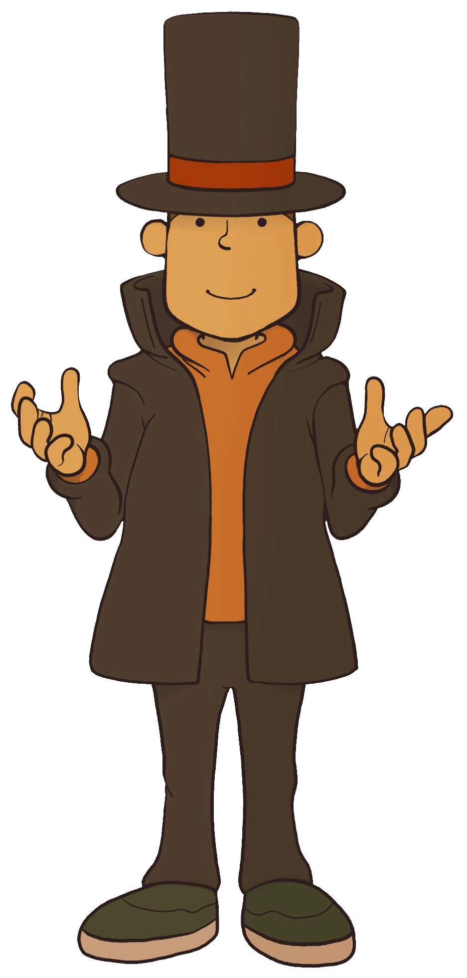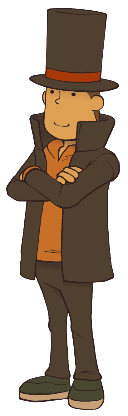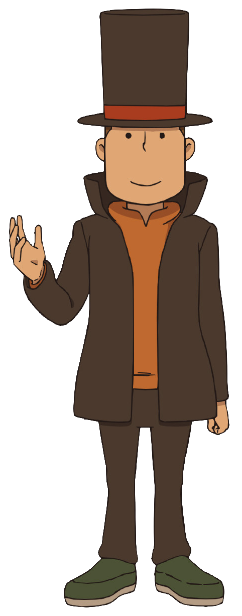 Layton's primary appearance in the franchise is that of a tall, fair-skinned, brown-haired man. His face is very simplistic in design: his eyes are black dots, like those of his mother; his ears are round with no visible anatomy; and his nose is a simple bump, with its bridge being a single line. His most defining feature is his top hat, which is tall and brown with a red lint, and covers his thin eyebrows. He wears a brown coat with its collar upturned over a dark orange shirt, brown pants, and a pair of dark green shoes with white soles. Underneath his top hat, he has a somewhat messy hairstyle.