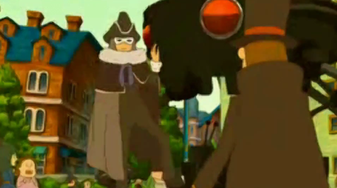 As dawn approached, Layton, Emmy, and Luke proceeded with their investigation, searching areas on the western side of Misthallery. After some careful thought, Layton solved the riddles presented by the many children running about the marketplace. Following their search throughout the market, more and more stories and thoughts on the nature of the specter began to arise. Suddenly, as the trio were walking about the central plaza in the market, a shadowy, cloaked figure jumped from a chimney atop one of the buildings.