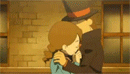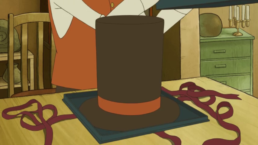 - In Diabolical Box, Layton's hat leaves his head for a split second, although the top of his head is not visible due to him ducking.
