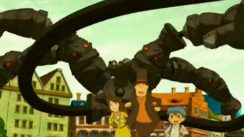 Layton used the flying machine to land on the Detragigant. With its drill tail, Descole tried to destroy the flying machine. Janice jumped on him, but was thrown to the edge of the Detragigant. Luke jumped off the flying contraption to land on the Detragigant and save Janice. The drill finally impaled Layton's machine, and it exploded. Layton jumped off and was saved.