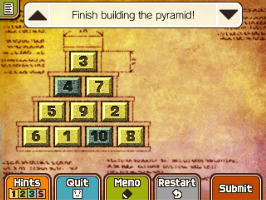 A Puzzling Pyramid is a puzzle in Professor Layton and the Azran Legacy.