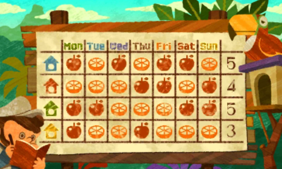 This tropical bird has a terribly unbalanced diet, eating only one kind of fruit per day: either apples or oranges. Each day, the bird keeper places fruit into each of the four coloured bird boxes according to his chart. The bird decides which king of fruit he would eat that day, and then eats every piece of it.