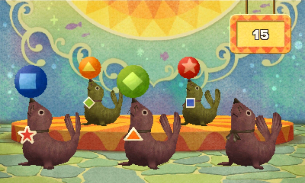 The sea lion's bows show which ball they should have, and it's up to you to get each ball to its rightful nose. However, bear in mind that the sea lions can't pass the balls very far. Looking at the Touch Screen, you can only move a ball to an adjacent sea lion or the next one along from that. As you may have guessed, the sea lion without a shape on its bow doesn't require a ball.