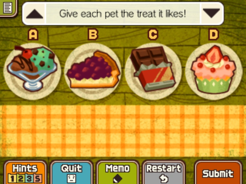 Pampering Your Pets is a puzzle in Professor Layton and the Azran Legacy. The puzzle must be solved in order to progress the story.