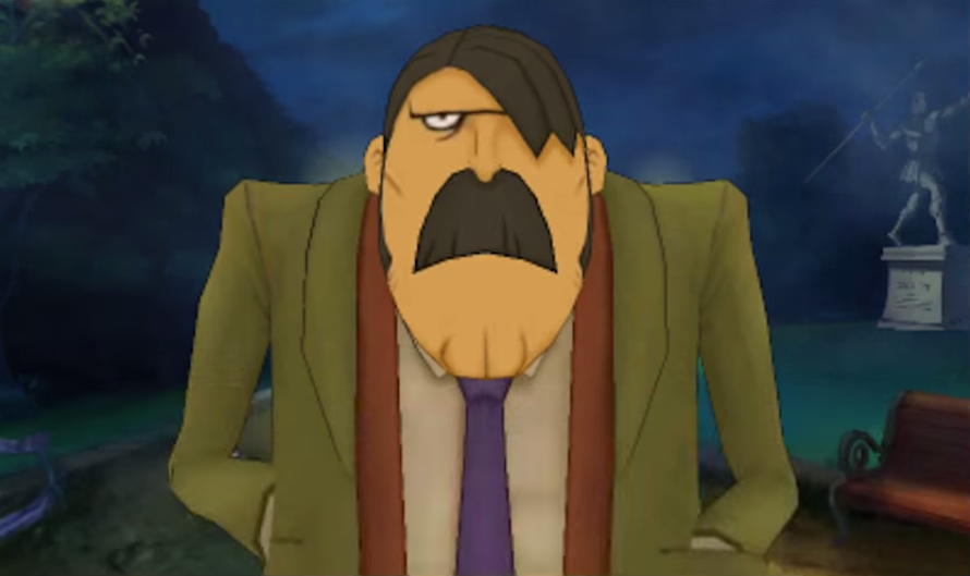 Throughout the conversation, Chelmey would refuse to divulge information, only to engage in a long, awkward pause before giving the information away. He explained that it was due to his "rivalry" with Layton. Chelmey would be happy to give Layton information, but since that would be too simple, he would resist. Layton assured Chelmey that he considered him not a rival, but a friend. Chelmey also said that Constable Barton would normally be leaking the information, which explained the awkward pauses.